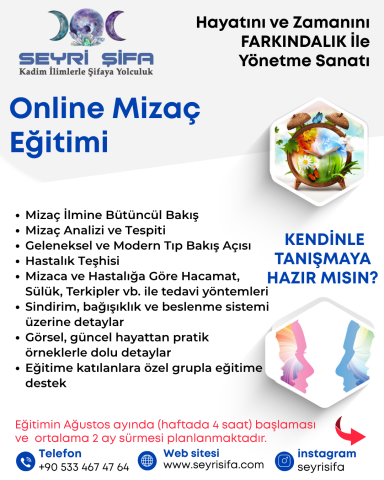 Bu ilim size hayatınızın her anında FARKINDALIK içinde olmanızı ve her anınızı maksimum verimlilikle yönetebilmenizi sağlar. İnsan hayatı boyunca sürekli çeşitli kapıları açmak için uğraşır. Nedir bu kapılar? Başarılı, sağlıklı, akıllı, kontrollü, seven, sevilen, beğenilen, takdir edilen, üretici ve en önemlisi kendisini değerli, mutlu hissetmek değil mi? Keşke insanın elinde bir şifre olsa ve tüm bu kapıları hemen açsın dediğinizi duyar gibiyim. O şifreyi aramayın, zaten SİZ varsınız. Bu kapılarının şifresi sizsiniz ve MİZAÇ İLMİ ile bu kilitli kapıları açmayı öğreneceksiniz. Bu eğitimde ezber veya ansiklopedik verilere ağırlık verilmemiştir. Eğitim içeriğindeki konular ve örnekler özellikle neden/sonuç ilişkisi ile ve görsellerle desteklenmektedir. Örnekler ve anlatımlar günlük hayatta karşılaştığımız konulardan seçilmekte ve uygulanabilir pratik çözümler sunulmaktadır. Ezbersiz, pratik ve sonuç odaklı bir MİZAÇ İLMİ ile hayatınıza yön vermeye hazır mısınız? Aşağıda bu ilimle birlikte müfredat içinde olan bazı konu başlıkları bulunmaktadır. Ayrıca eğitim alan kişilere özel grup açılarak eğitim sonrasında da 1-2 ay boyunca bilgilendirme/tecrübelendirme süreci devam ettirilecektir.