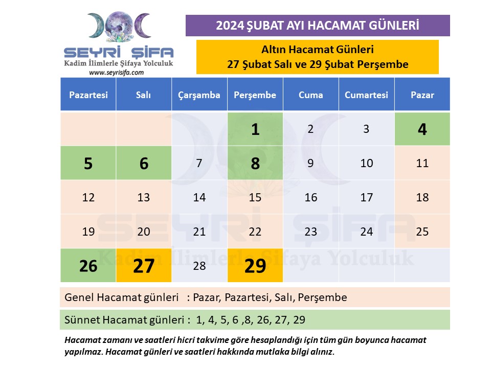 2024 Şubat Hacamat Günleri ile ilgili takvim aşağıdaki gibidir. 2024 Şubat ayınını Altın Hacamat günleri 27 Şubat Salı ve 29 Şubat Perşembe günüdür.